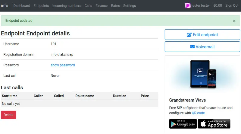 STEP-4 : Your Cloud Endpoint has been created. You can now connect any IP-Phone, softphone or Desktop phone using the data found in your endpoint’s setting.